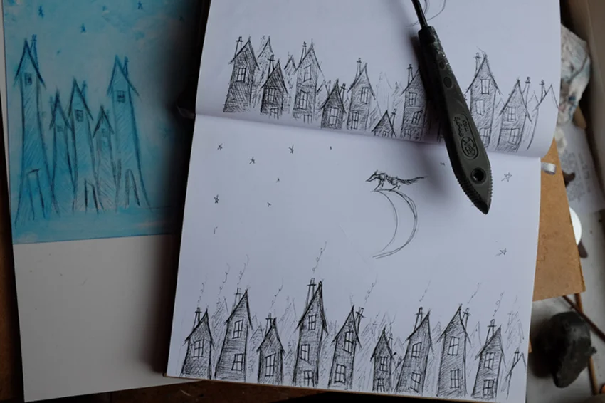 Upwards and Over is a place of play for me- I love sketching out animals, imagining some sort of life for them that we don't see, one filled with magic and adventure. I then make drypoint prints of the drawings- the odd marks, accidents and strong pigments adding to the atmosphere of the images. I never really make the same image twice- although the underlying illustration might stay the same I always add different mono print marks and use different colours and effects for endless variation. Often this means the same print appears in multiple colours - but each time has a different feel.